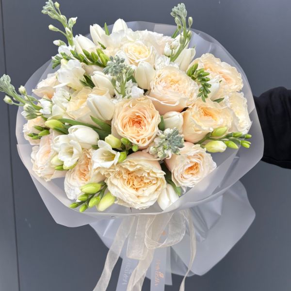 Троянда Крем Фрагранс - 15 шт., матіола - 5 шт., тюльпан - 14 шт., фрезія - 10 шт., пакування.