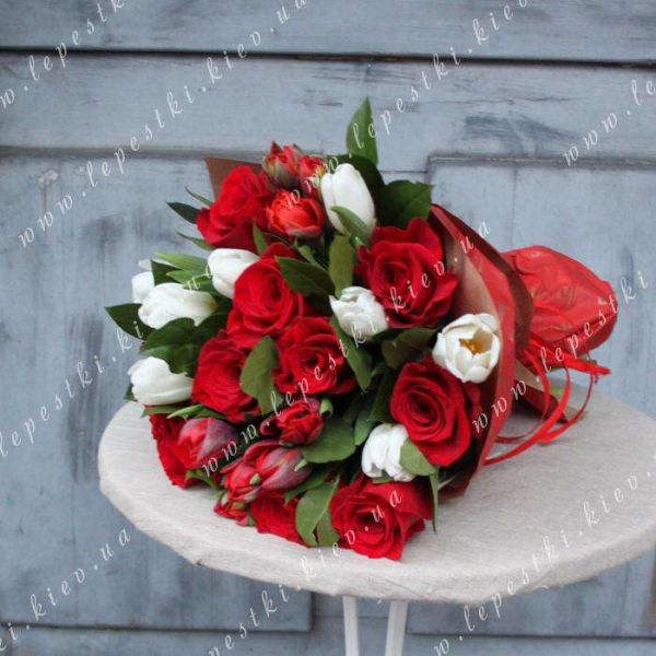 Замовлення квітів у Києві ще ніколи не було таким простим! Інтернет-магазин квітів "Пелюстки"пропонує вам розкішний букет «Танго», у якому гармонійно поєднуються червоні троянди та білі тюльпани. Цей букет стане ідеальним подарунком для особливої людини, вражаючи своєю яскравістю та витонченістю.