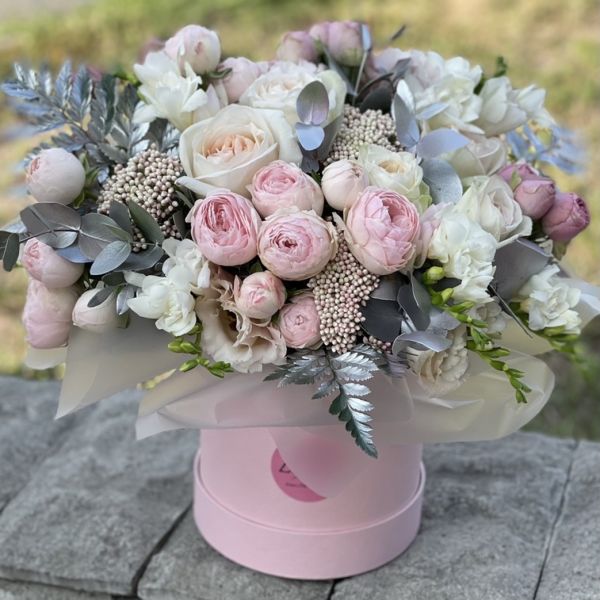 Ніжна композиція в коробці, яка поєднує делікатні текстури і благородні відтінки. Ароматна троянда Вайт О'Хара (5 шт.) гармонійно сусідить із елегантною Менсфілд Парк (3 шт.) та тендітною кущовою трояндою (3 шт.). Композицію доповнюють витончені фрезії (5 шт.), еустома (2 шт.), рисові квіти (3 шт.) та свіжа зелень, що створює природний акцент. Квіти розміщені в оазисі в стильній коробці, яка зберігає їхню свіжість і естетику. Ідеальний варіант для приємного подарунку чи компліменту.