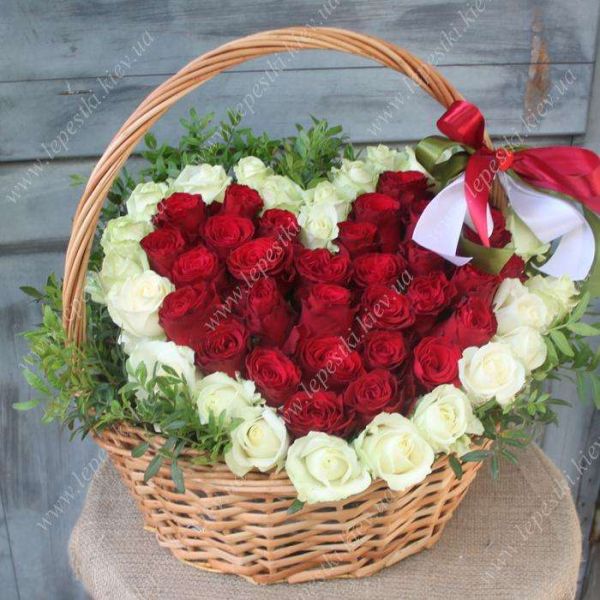 Головний акцент – це троянди двох класичних відтінків: білого та червоного, які у флористиці символізують чистоту та пристрасне кохання. Вони дбайливо викладені у формі серця руками наших досвідчених флористів, створюючи вражаючий ефект.