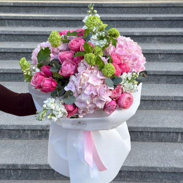 Ніжна та витончена композиція з гортензій, вібурнуму, матіоли та кущових троянд створює настрій справжньої весняної гармонії. 3 об’ємні гортензії надають букету текстурності, 4 зеленкуваті кулясті вібурнуми додають свіжості, 5 матіол — легкості й аромату, а 7 ніжних кущових троянд — романтичності. Цей букет підійде як для святкування, так і як знак турботи без приводу. Упакований зі смаком — даруйте враження.